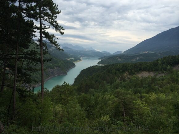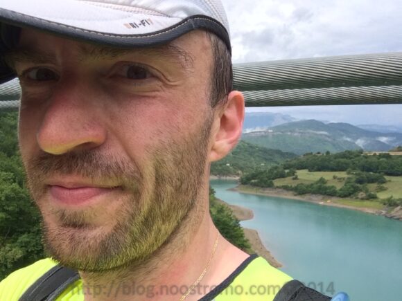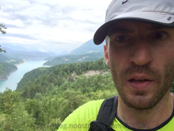 Interdit de courir sur les passerelles. Tout le monde marche. J’en profite pour récupérer un peu des 5 premiers kilomètres. La passerelle oscille beaucoup, il faut souvent se tenir pour ne pas tomber. C’est beau. Le lac du Monteynard est un lac artificiel créé par la construction d’un barrage en 1962. C’est un petit paradis pour les activités nautiques, mais aussi, avec la construction de 2 passerelles himalayennes, pour la randonnée, le VTT et donc le trail-running.